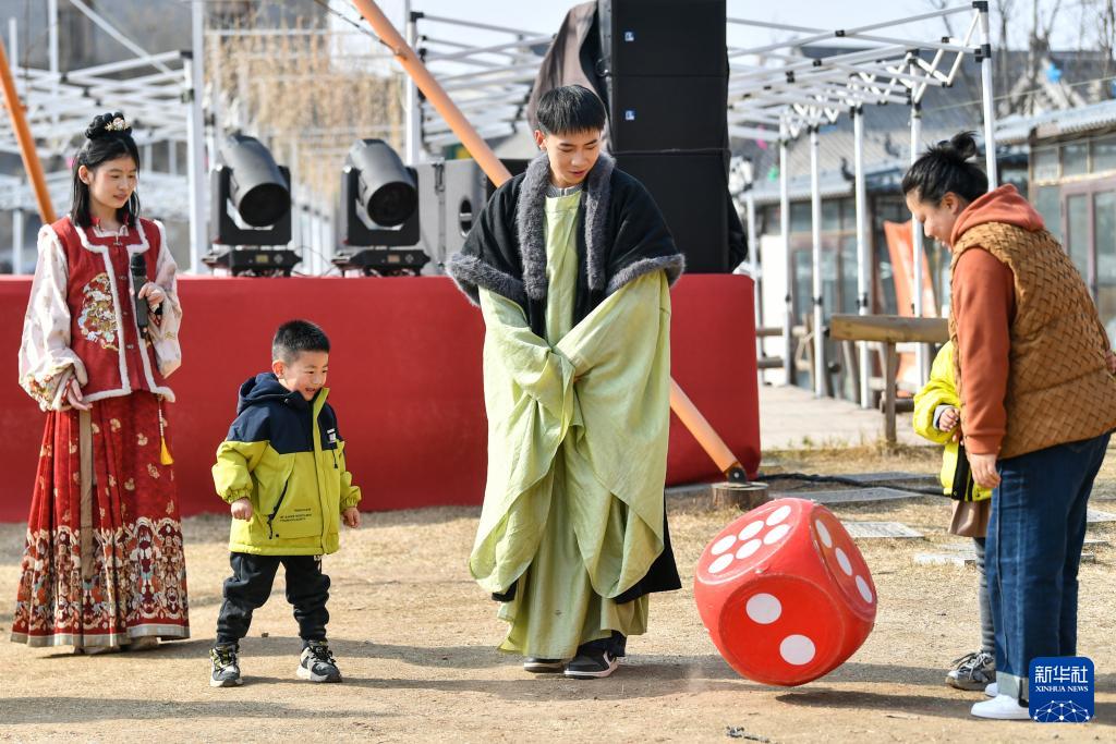 2月25日,游客在山西太原古县城参加趣味活动。
